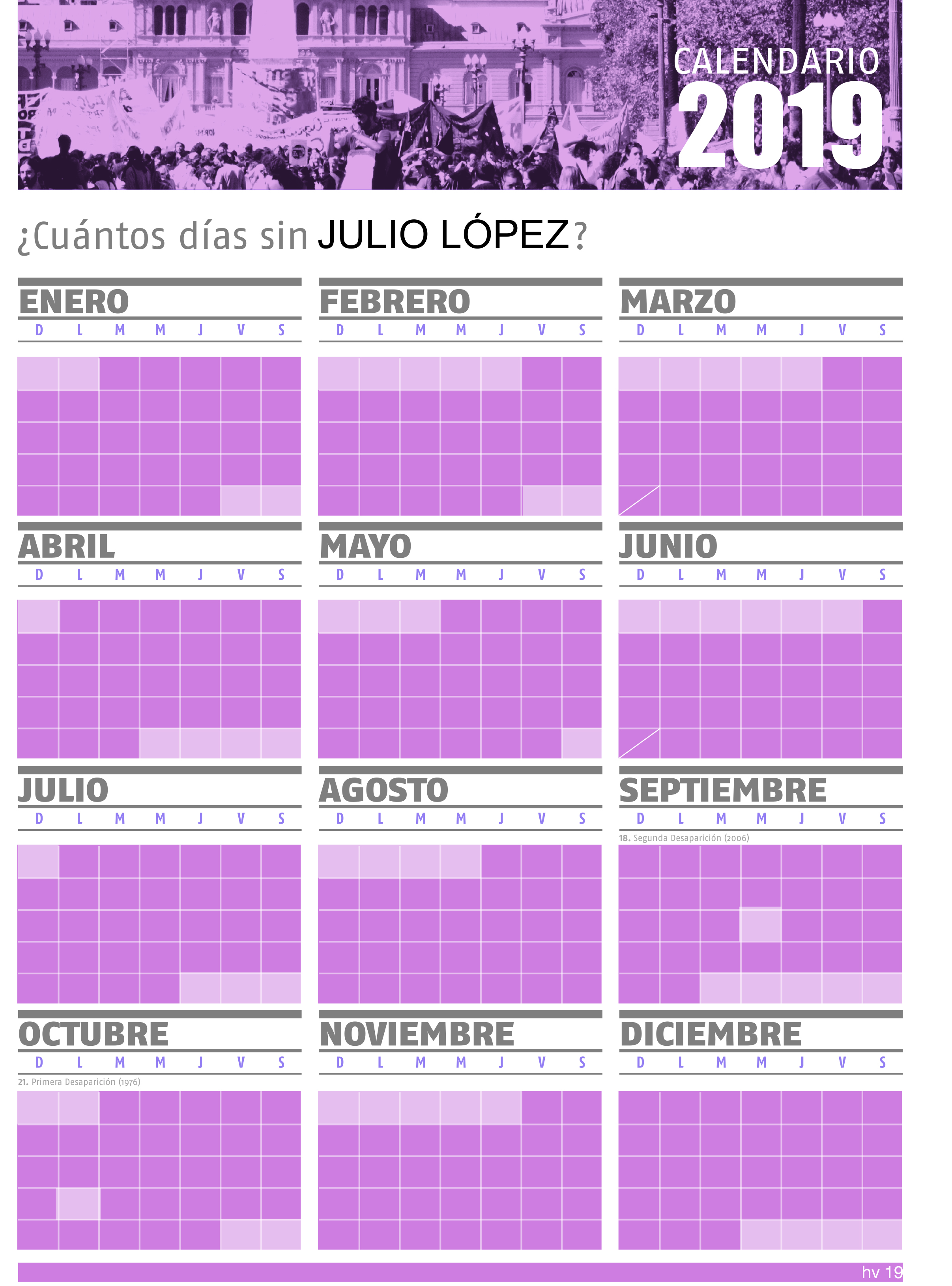 Edición de un calendario, vacío de números, encabezado por una frase que interroga: ¿Cuántos días sin López? Esta frase es una clara invitación a intervenir en el calendario día a día. Se informa que al 1 de Enero de 2008 transcurrieron 470 días desde su segundo y último secuestro. Se verifican muy diversas intervenciones manuscritas en el calendario. Tales como: enumerar, puntear, tachar, sombrear, etc. La edición original es en tamaño A3, papel 220 gramos, semi mate, a color, celeste y negro. Le sucede una edición en tamaño afiche, impresión offset, en blanco y negro. Ambas ediciones circulan ampliamente. La primera edición circula mano en mano, excediendo el ámbito artístico. También resulta publicada en periódicos y próximamente en un diario. Incluso en el exterior, en la revista Third text , de Londres, Inglaterra. Por su parte el afiche fue instalado en muros de la ciudad de Buenos Aires y del suburbio, y en algunas ciudades del país. En esta pieza grafica trabajo sobre la percepción que tenemos del tiempo, alterando su representación habitual, eliminando la representación cíclica, evidenciando la acumulación del tiempo transcurrido. Se editó una versión 2009 del almanaque. Modificando su color y manteniendo el resto de sus características.