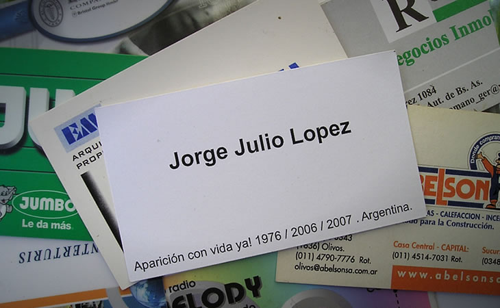 Edición de varios miles de tarjetas tipo personal, comercial, etc. Del tamaño Standard. En blanco y negro. Sin recuadro, ni subrayados. La alteración propuesta en esta pieza es asumir otro nombre. Es decir desplazarse del nombre propio. En este caso se asume el nombre de Jorge Julio López. Al pie de la tarjeta, donde habitualmente se disponen los datos para dar con el titular, en este caso particular, se coloca la demanda por su aparición con vida. Y se agregan las fechas de sus dos desapariciones. Esta pieza circula de mano en mano, repartida por varias personas en muy diferentes ámbitos. También se realizan envíos postales. Además se han realizado perfomances aprovechando reuniones. En este caso acostumbro expresar una sola palabra: llamame!!