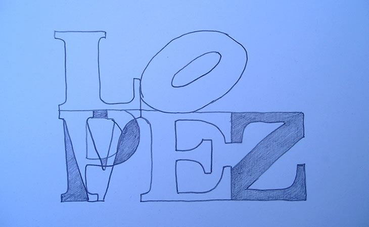 Dibujo, realizado en grafito, citando la obra de Robert Indiana (Love, 1966). Medidas variables. Es un trabajo del año 2009.